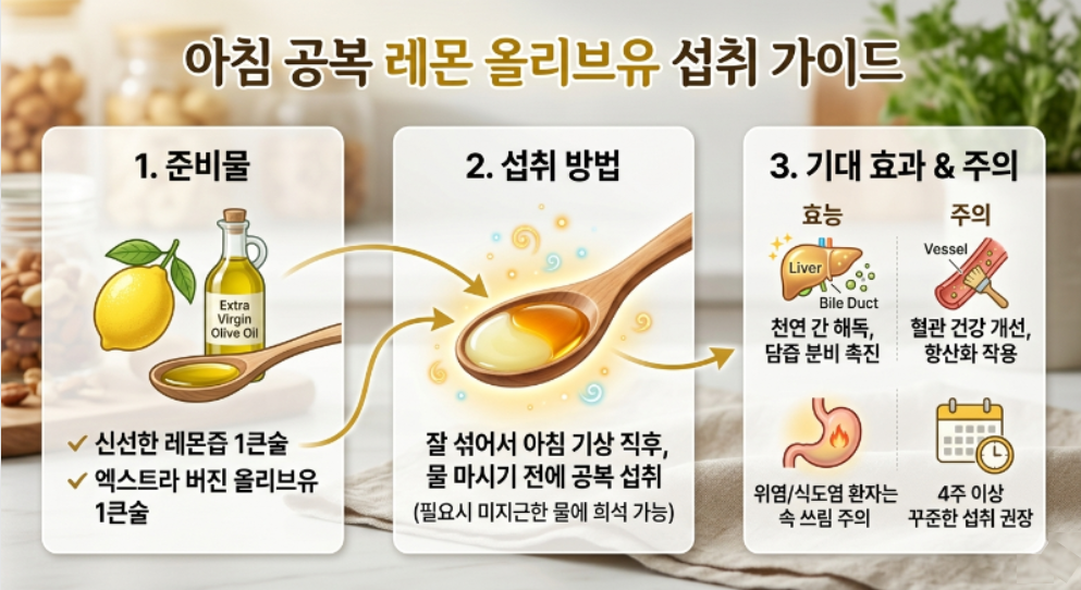 - 방법: 아침 기상 직후, 물을 마시기 전에 이 혼합물을 먼저 섭취합니다. 맛이 너무 강하다면 미지근한 물 한 컵에 섞어서 '레몬 올리브 티' 형태로 드셔도 무방합니다.