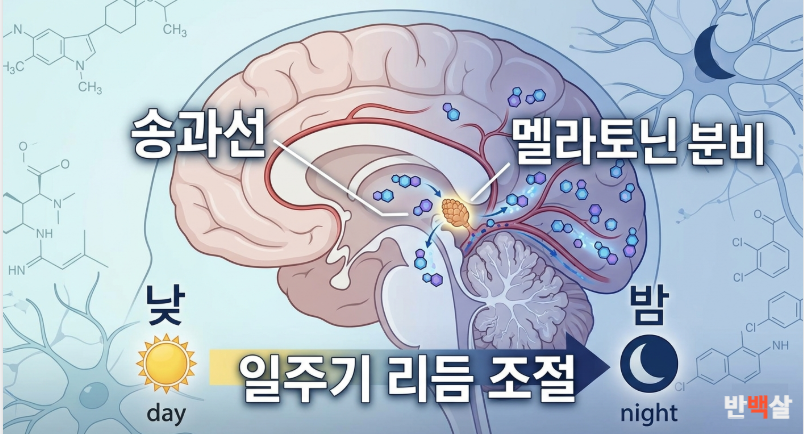 멜라토닌은 뇌의 송과선에서 분비되는 호르몬입니다. 가장 중요한 역할은 우리 몸의 '일주기 리듬(Circadian Rhythm)'을 조절하는 것입니다.