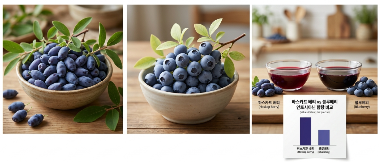 - 블루베리: Malvidin, Delphinidin, Petunidin 등 다양한 안토시아닌을 함유하고 있지만, 하스카프 베리에 비하면 그 다양성과 농도는 낮습니다.